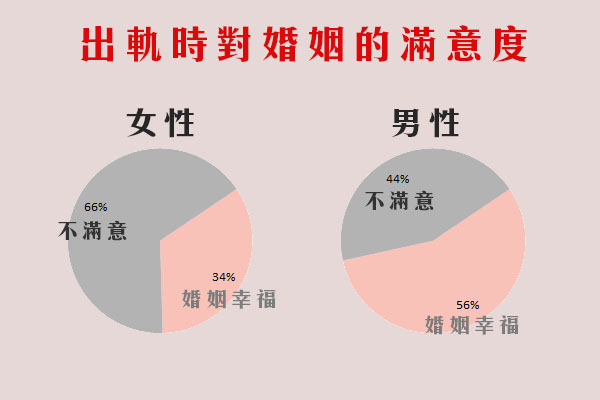 女生出軌的原因,更有可能是她們不享受這段感情。有婚外情的男生,卻有56%覺得婚姻幸福;但是外遇的女生當中,只有34%滿意她們的婚姻。