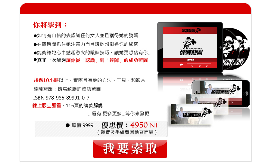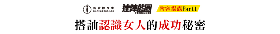 在「達陣藍圖」中,我們將使用真實拍攝的男女互動影片作為教學藍本,讓你從最真實的互動中學習認識女人的技巧,你將在這些影片中獲得文字無法敘述的肢體語言和聲音表情技巧,除了能破除以往看書只能瞎子摸象的窘境外,更能夠讓你在最短的時間內抓到和女生聊天的訣竅,從此在和女人互動時能夠從容不迫的大方聊天。 | ![]() |