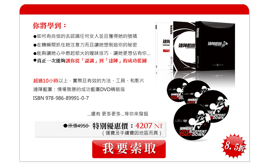 在「達陣藍圖」中,我們將使用真實拍攝的男女互動影片作為教學藍本,讓你從最真實的互動中學習認識女人的技巧,你將在這些影片中獲得文字無法敘述的肢體語言和聲音表情技巧,除了能破除以往看書只能瞎子摸象的窘境外,更能夠讓你在最短的時間內抓到和女生聊天的訣竅,從此在和女人互動時能夠從容不迫的大方聊天。 | ![]() |