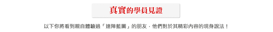 在「達陣藍圖」中,我們將使用真實拍攝的男女互動影片作為教學藍本,讓你從最真實的互動中學習認識女人的技巧,你將在這些影片中獲得文字無法敘述的肢體語言和聲音表情技巧,除了能破除以往看書只能瞎子摸象的窘境外,更能夠讓你在最短的時間內抓到和女生聊天的訣竅,從此在和女人互動時能夠從容不迫的大方聊天。 | ![]() |