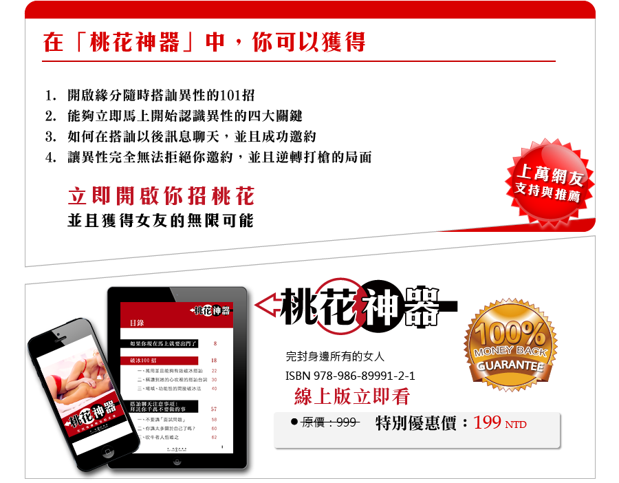 我們這次特別將桃花神器製作成超過百頁的電子書,讓你能夠在滑手機時隨時都能把妹,並且在未來當碰到桃花時,就能立即翻閱到你需要的桃花神器招數,最大化讓你獲得成功的機率。
